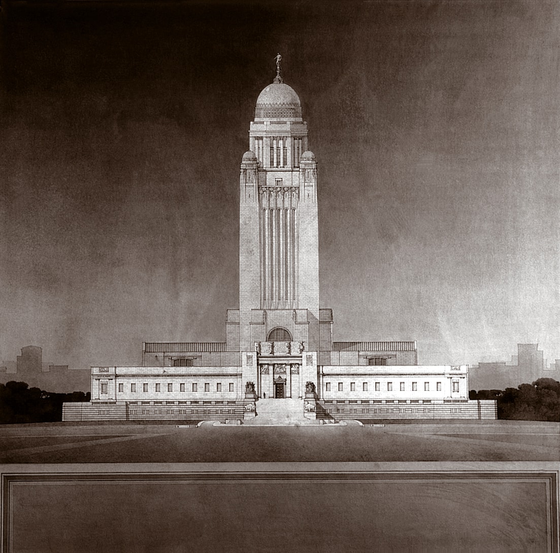As the designs for the Joslyn Building were taking shape in Omaha in the late 1920s, the Nebraska State Capitol building was under construction about 60 miles west in Lincoln. Designed by California architect Bertram Goodhue as a radical departure from typical state buildings of the time, the State Capitol was a dramatic form—a tower rising out of a spreading base. The building referenced the ultimate symbol of American modernity, the skyscraper, with distinct local characteristics. Goodhue utilized the Art Deco style for the building—sharp-angled geometry, smooth surfaces, and shimmering color. The Art Deco style is epitomized by skyscrapers like New York City’s Chrysler (1930) and Empire State (1931) Buildings, both under construction at the same time as The Joslyn. The influence of Goodhue’s work in Lincoln and the rise of Art Deco impressed and influenced architects John and Alan McDonald to completely recast the Joslyn Memorial, already under construction, in a modern style.