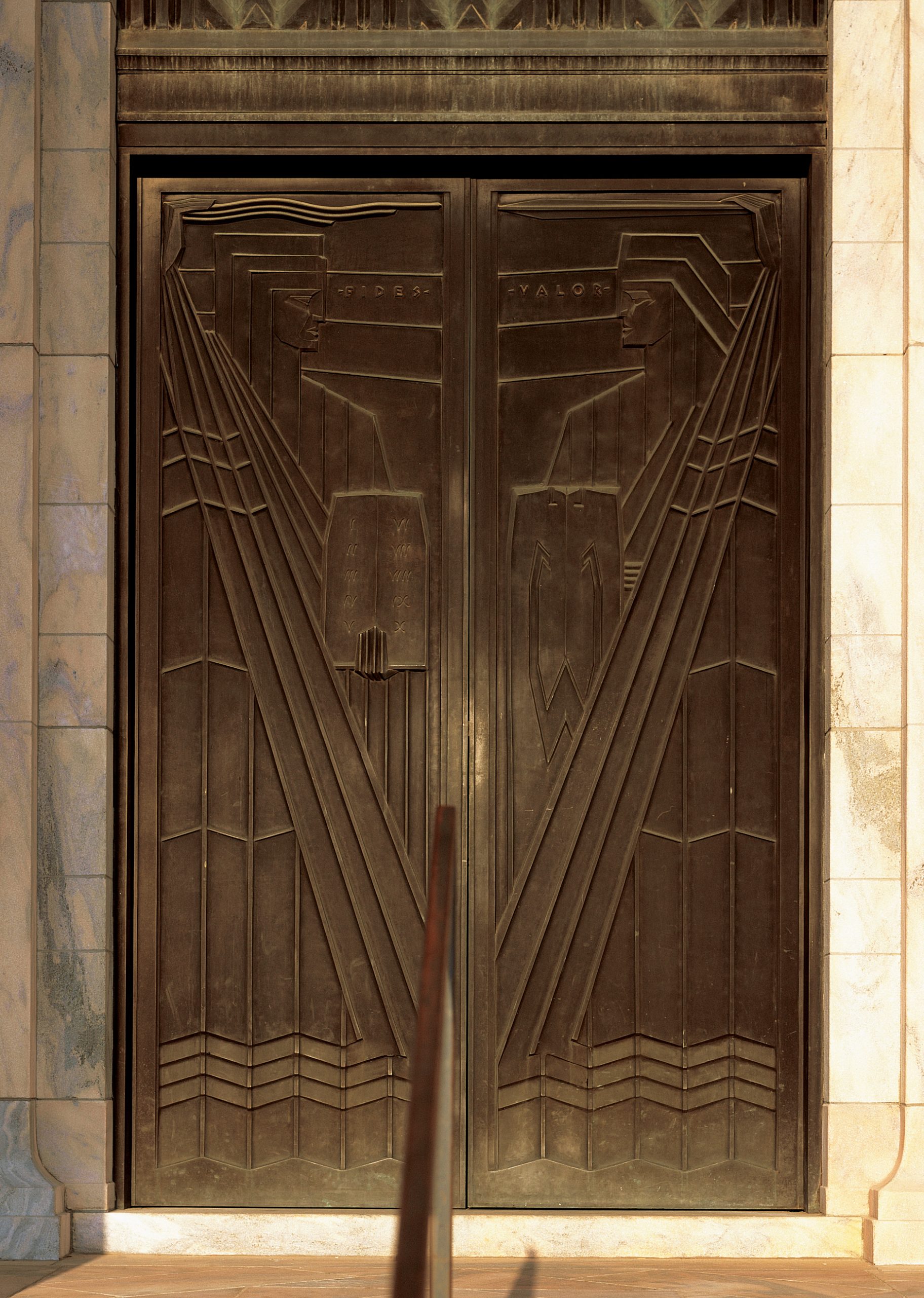 The Joslyn Memorial was so named as founder Sarah Joslyn meant the building to serve as a memorial to her husband, George. The east facade, specifically dedicated to him, carries a memorial identification, a dedicatory inscription, and two sculptural panels honoring his newspaper career. The subject matter of the six panels of the east entrance doors was chosen to express George Joslyn’s personal virtues and to pair the three traditional values of Faith, Hope, and Charity with individual qualities that lay behind his worldly success: Courage, Vision, and Industry.