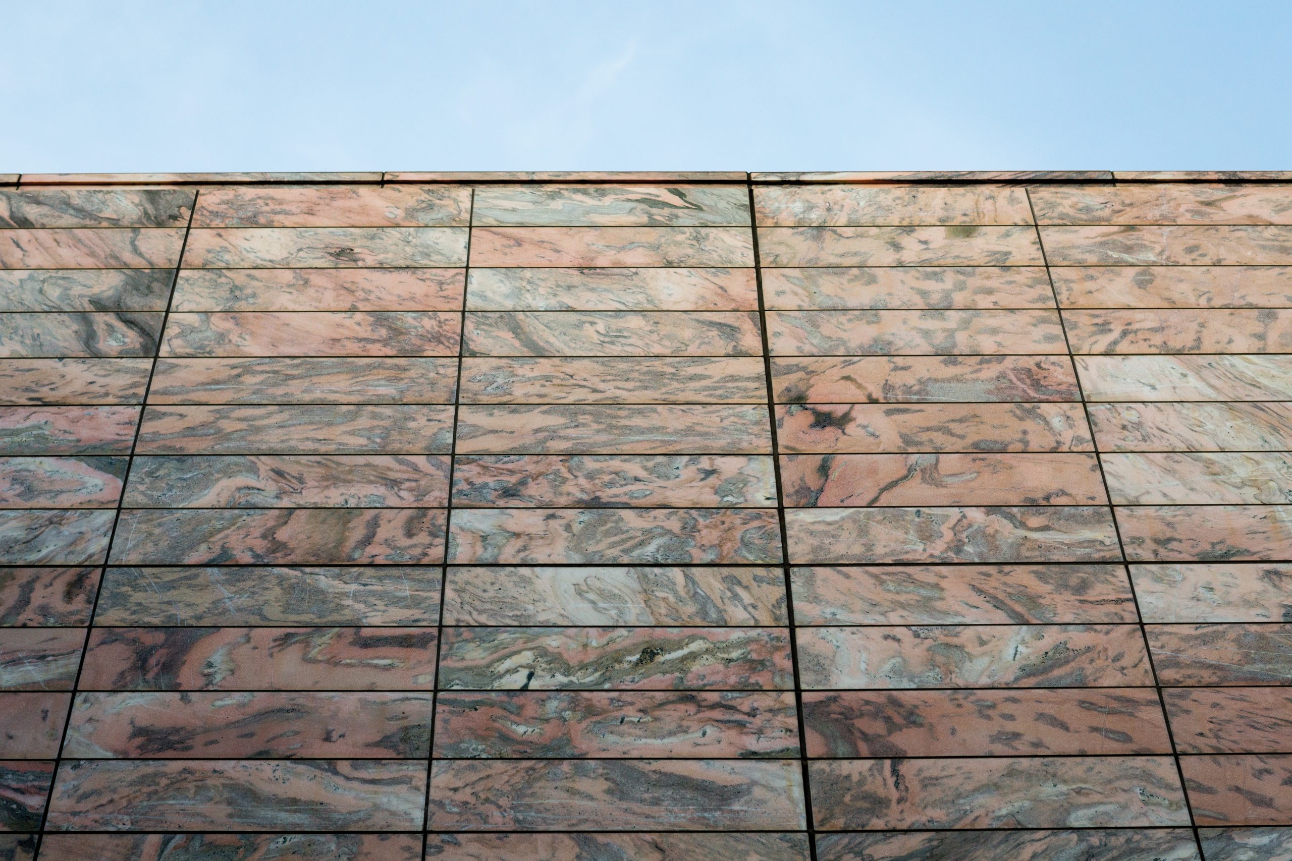 The streamlined exterior is composed of large expanses of Etowah Fleuri (Georgia Pink) marble. Quarried in Tate, Georgia, this distinctive metamorphic rock is characterized by waves or veining in shades of rose-pink, grey, and white that run through a salmon pink background. The three-level interior comprises some 38 marbles from around the world and includes stone from Italy, France, Belgium, and Morocco.