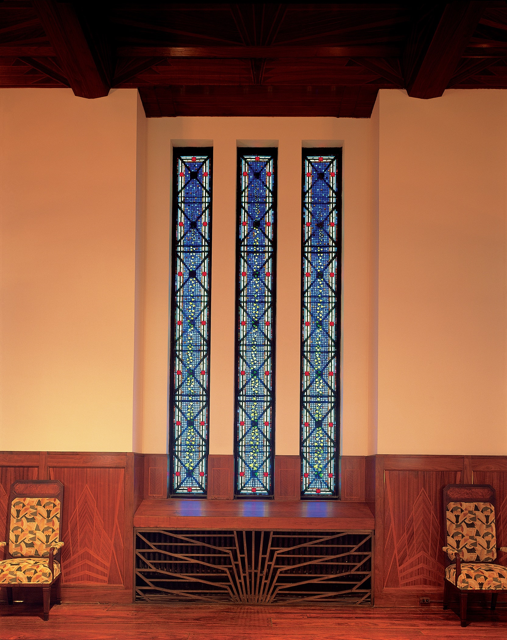 The Founder’s Room offers a departure from the materials that feature so prominently throughout the rest of the building. The walls are walnut inlaid with peroba and the floor is teakwood. The thunderbird motif dominates the wood ceiling and is reflected in the light fixtures. A fireplace in the room is Benou Jaune marble—the only marble in the space. The ivy design in the stained-glass windows was ordered by Sarah Joslyn as a special remembrance for her husband.