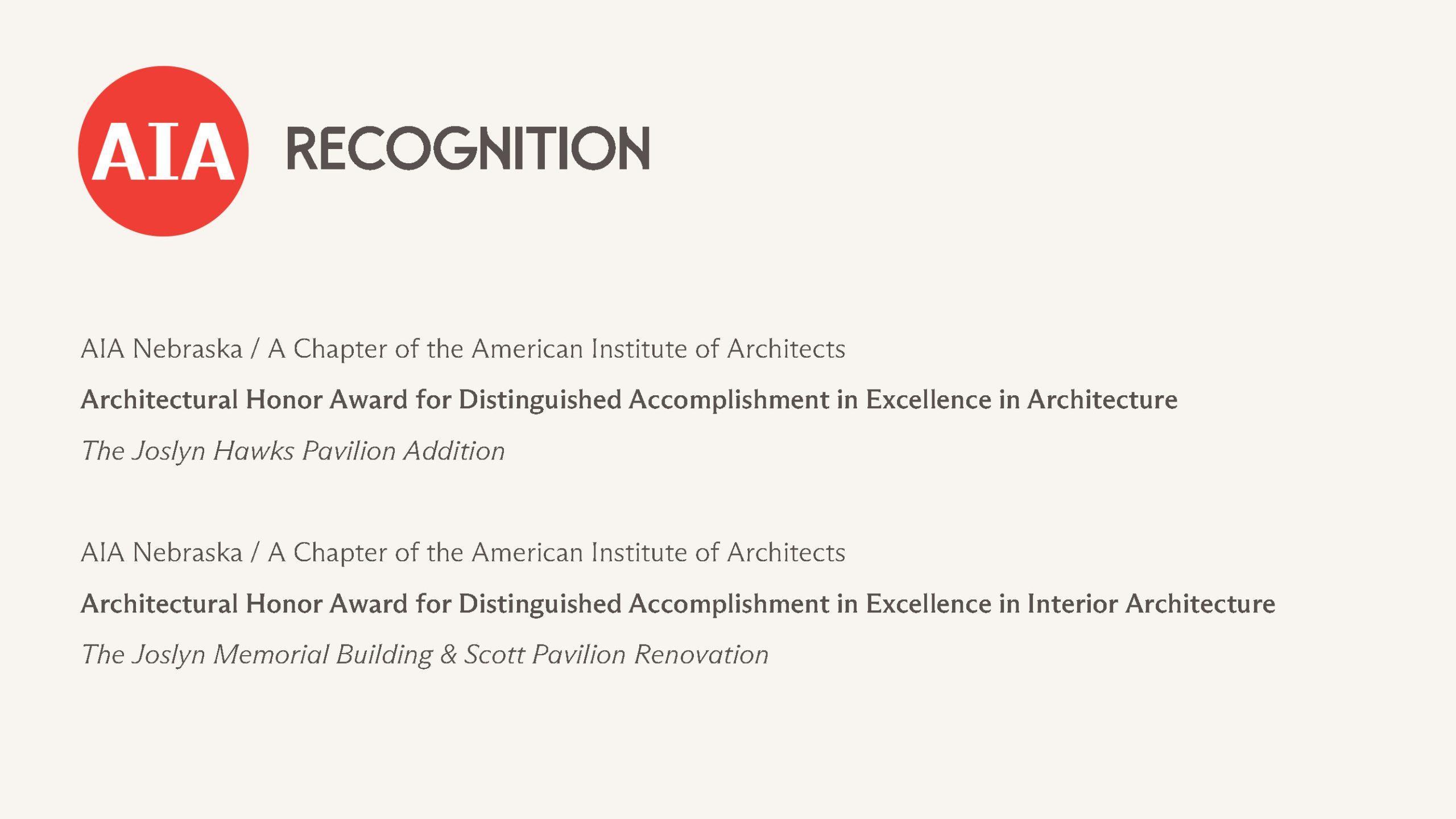 Complete list of honors and awards presented to Joslyn Art Museum since the debut of its expansion, the Rhonda & Howard Hawks Pavilion, in September 2024.